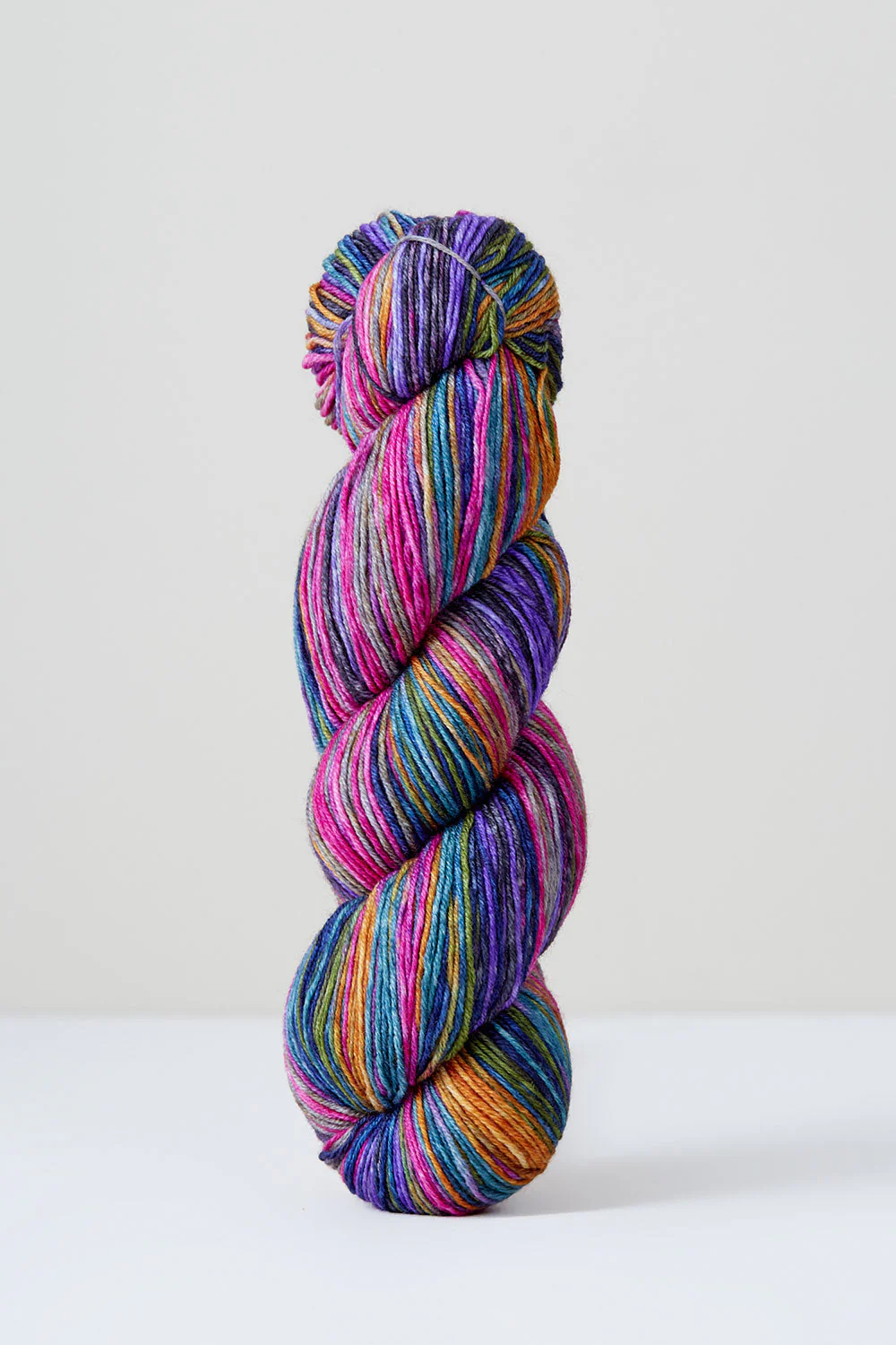 Die selbststreifende Magie von Uneek Fingering entfaltet sich durch Streifenpaare und wechselt dabei subtil die Farben,